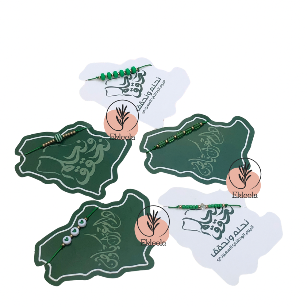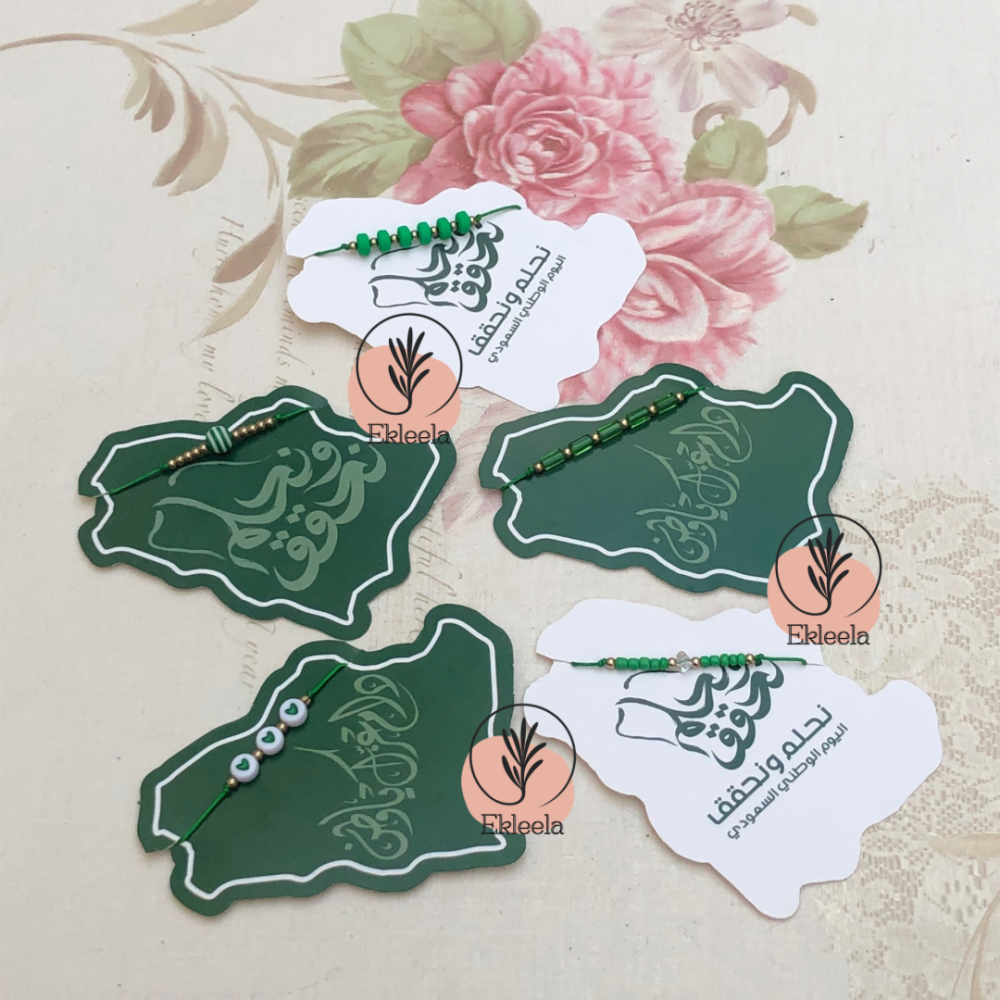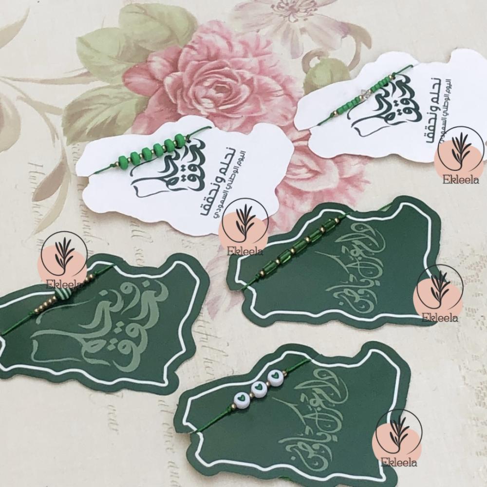 توزيعات اساور مع ثيم ورقي عن اليوم الوطني نحلم ونحقق ودام عزك ياوطن ( 12 قطعه )