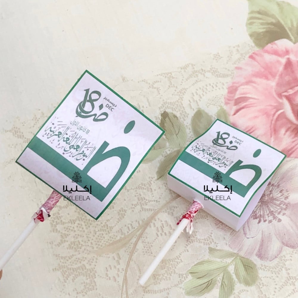 توزيعات ورقيه بثيم عن اليوم العالمي للغه العربيه مع حلاو مصاص