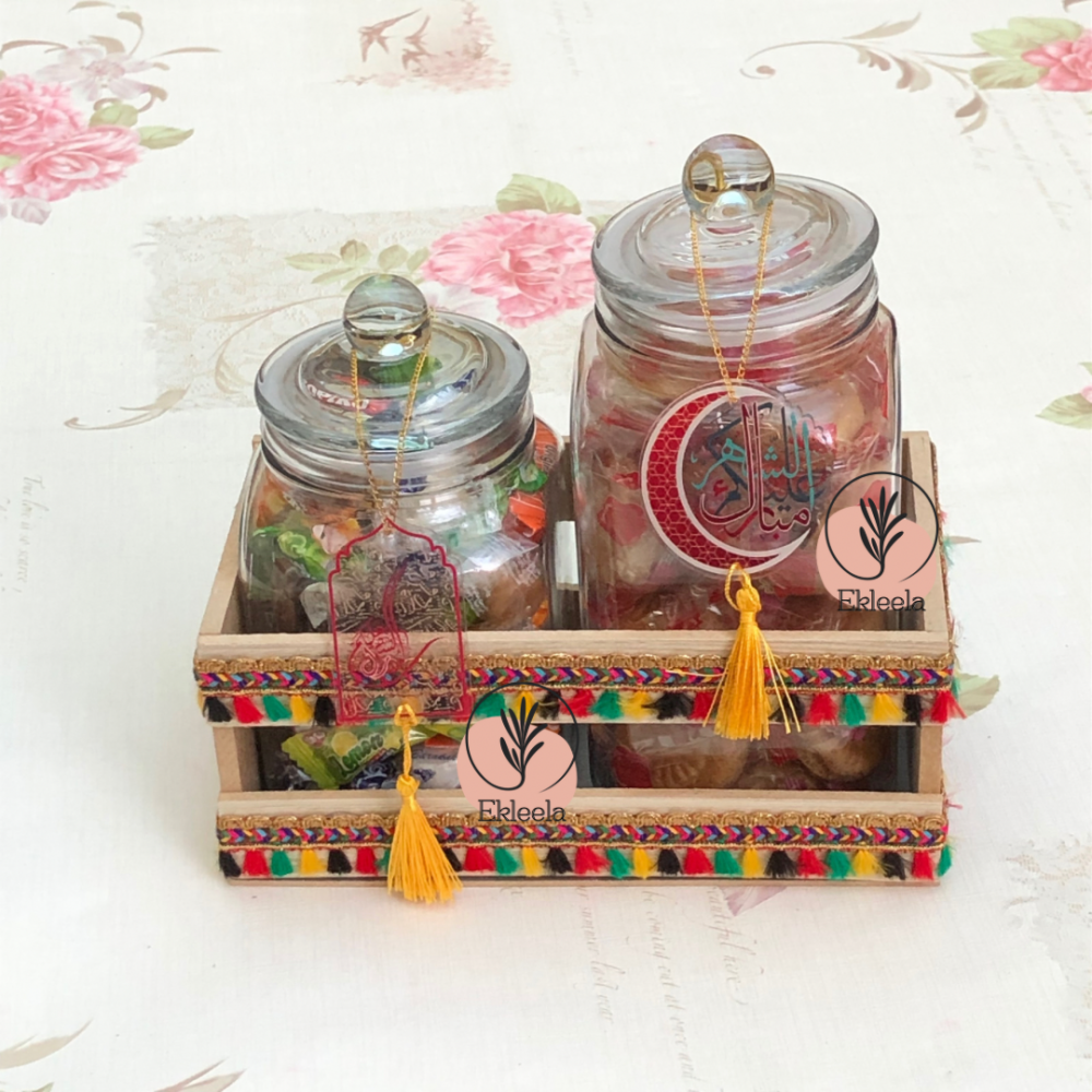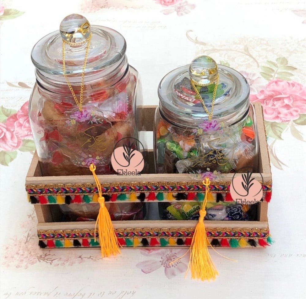 الصينيه مؤلفه من شيال خشب بها ( علبة زجاج بها 25 قطعة معمول تمر ، و علبه زجاج اخرى بها حلويات منوعه )