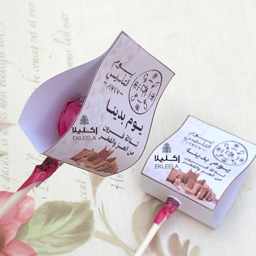 توزيعات ورقيه بثيم عن يوم التأسيس مع حلاو مصاص