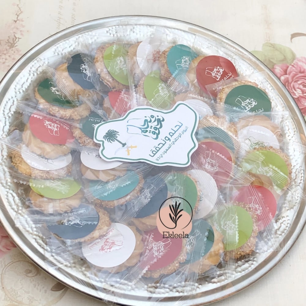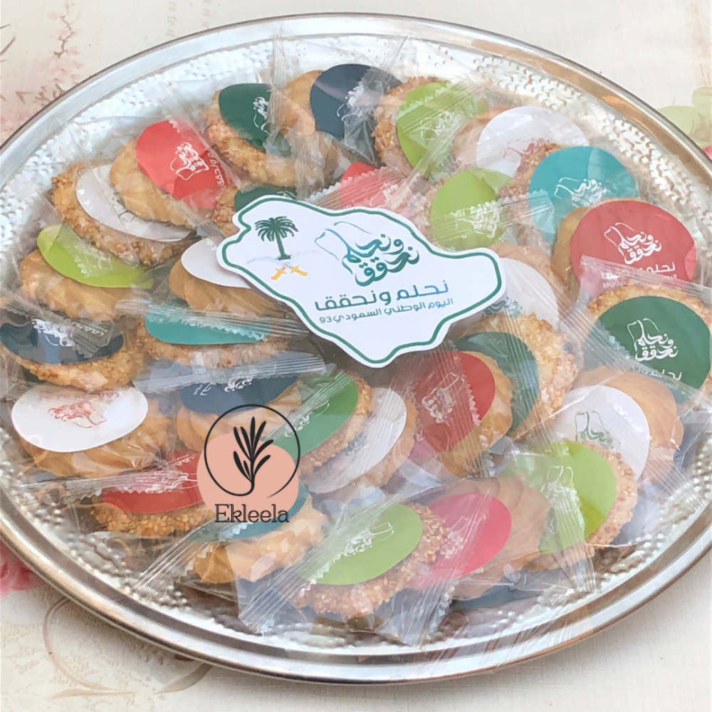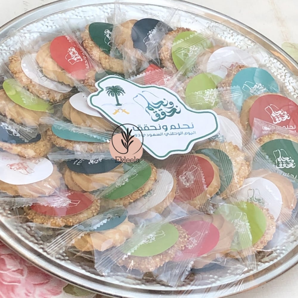 معبأة بـ 30 قطعه منوعه بين بيتيفور فانيليا و بسكوت سمسم مغلفه و مزينه باستيكر لليوم الوطني نحلم ونحقق