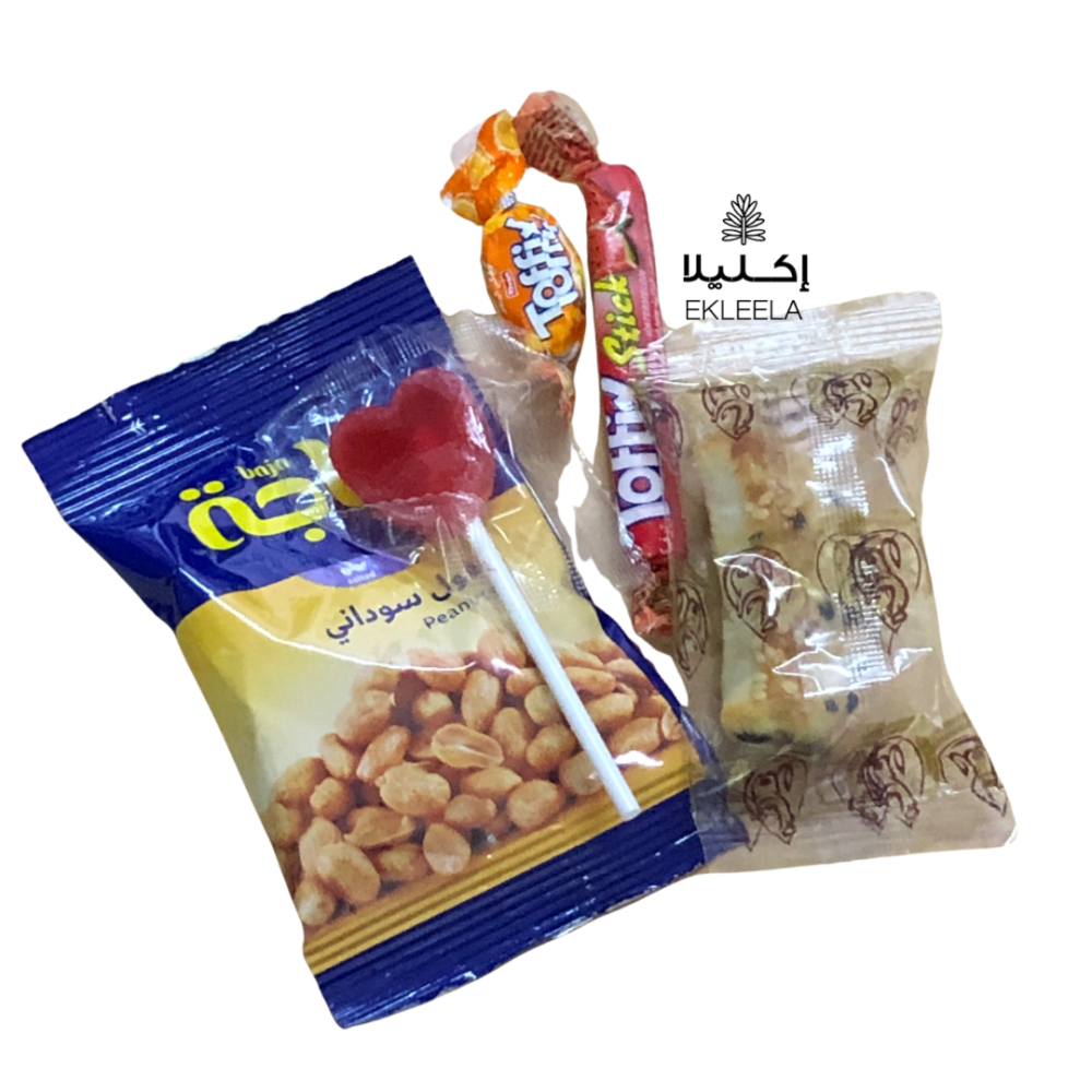التعبية موضحة بالصور ( قطعة معمول ، مكسرات باجه فول سوداني ، حلاو مصاص ، قطعتين حلاو )