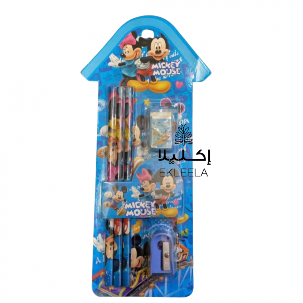 المجموعه مكونه من ( 3اقلام رصاص + 1 برايه + 1 ممحاه + 1 مسطره) بثيم كرتوني