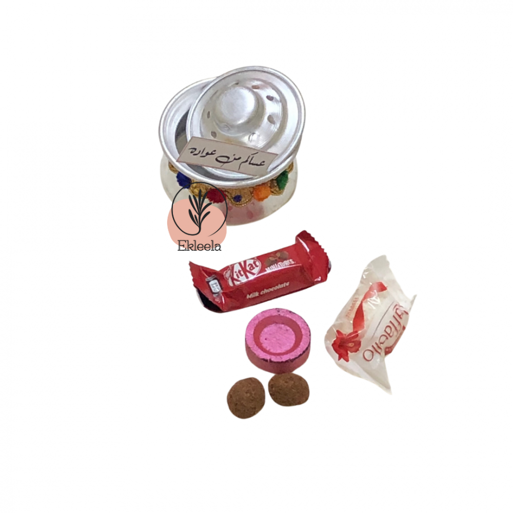 السعر يشمل 12 علبه معدنيه مع تعبيه ( ميني شكولاته كتكات او ميني سنكرس أو باونتي أو مارس حسب المتوفر ) ، شكولاه رافايلو ، قطعة فحم ملون + قطعتين معمول بخور )