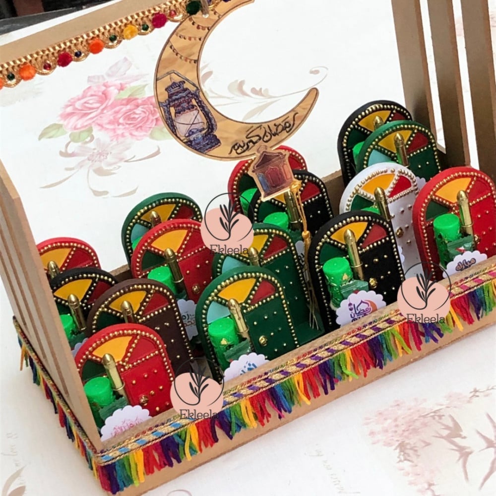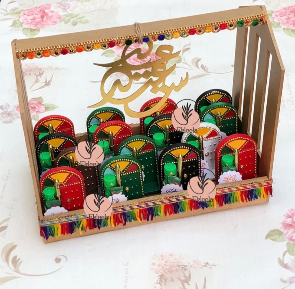 السعر يشمل الشيال الخشب مع 15 توزيعات ميني ابواب ملونه سيراميك مع تعبيه ( روج سحري + قلم كحل زمان + علك مستكه مع ثيم ورقي بعبارات منوعه )