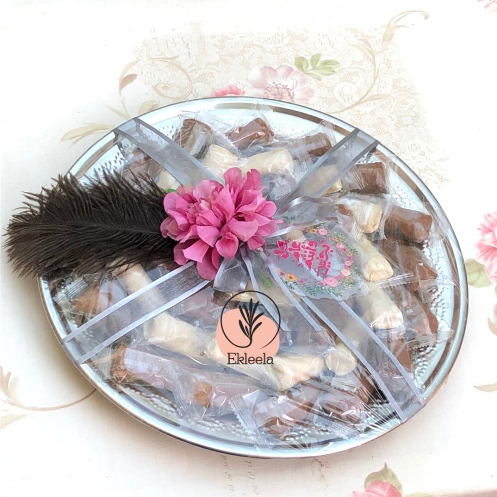 ان تكون معبأة بــ 40 قطعه معمول تمر مغلفه بشكولاه منوعه ) مزينه مع لوقو اكليريك بعبارة كل عام وانتم بخير
