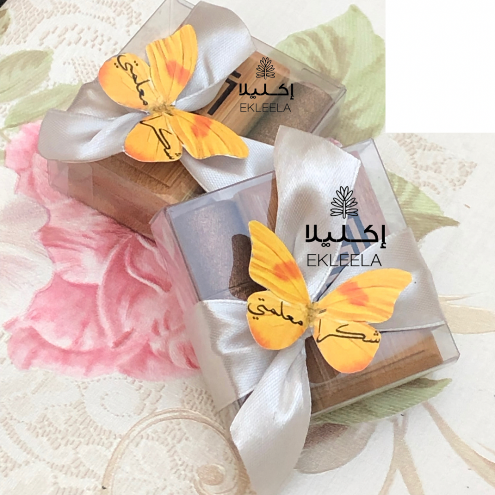 مبخره ذكيه مع علبه بها 20 عود الموروكي مزينه ومضاف لها ثيم ورقي على شكل فراشه بعبارة شكراً معلمي