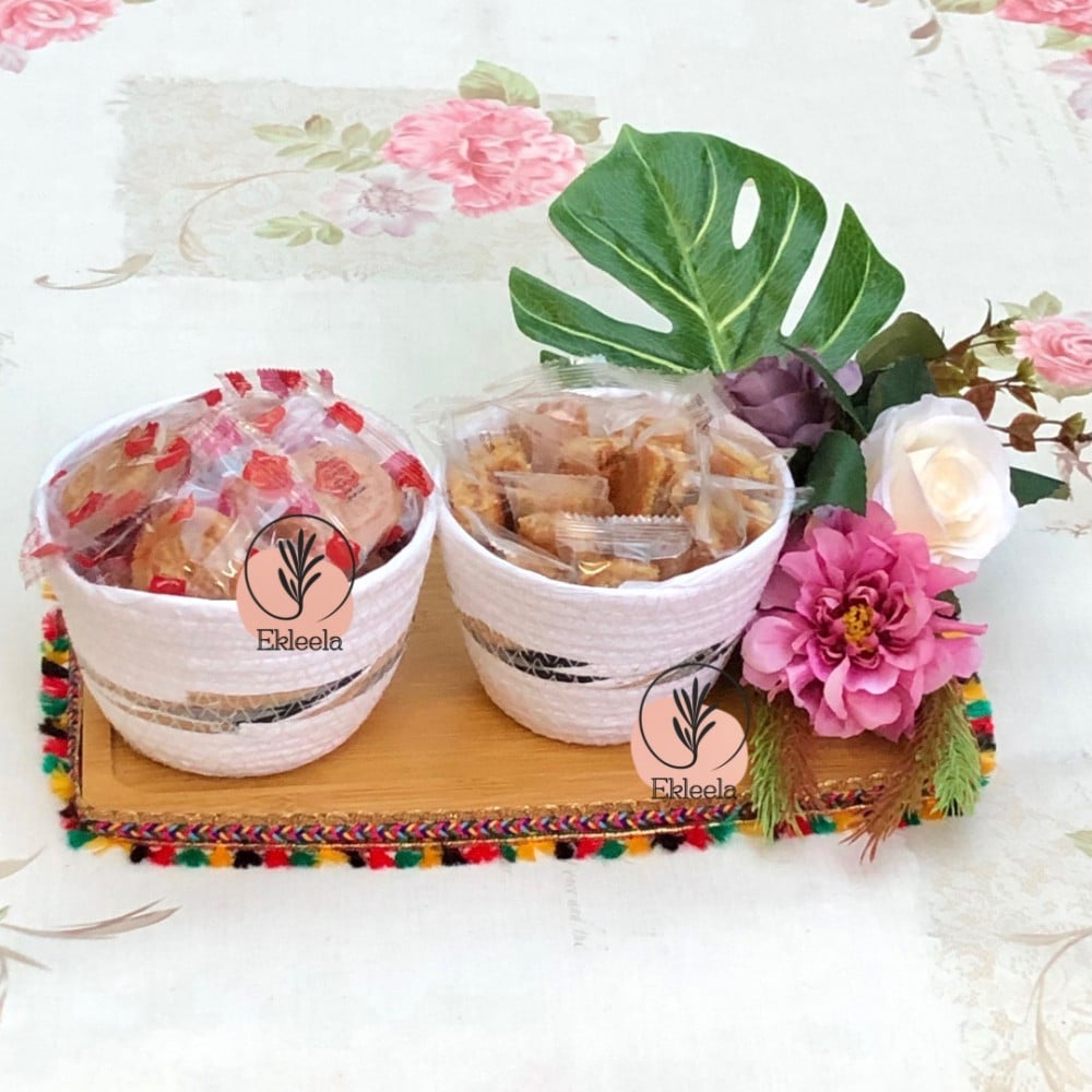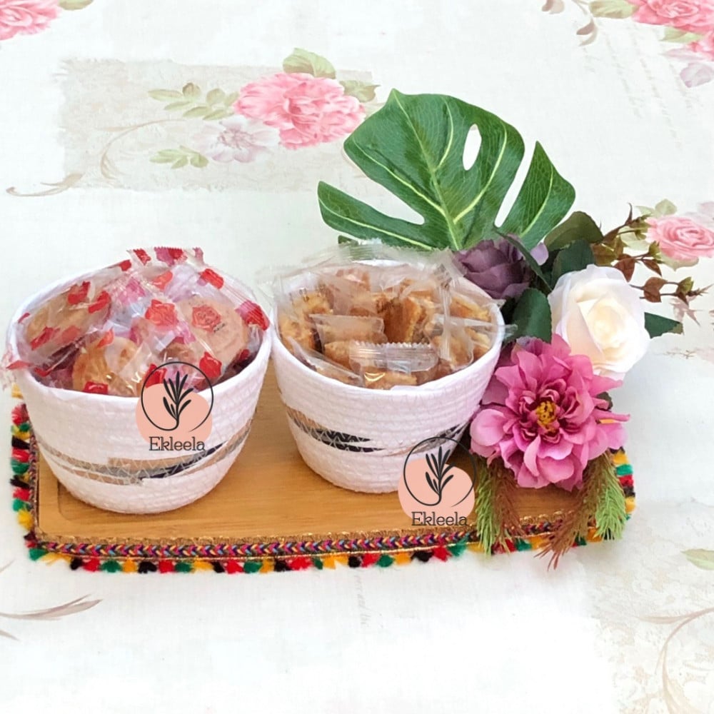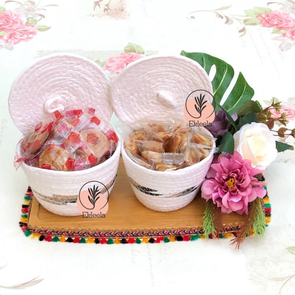 قاعده خشبيه بها ( سله بتعبيه 15 قطعه ميني بسبوسه بالتوفي ، وسله اخرى بتعبيه 15 قطعة معمول تمر ) مزينه بالورد