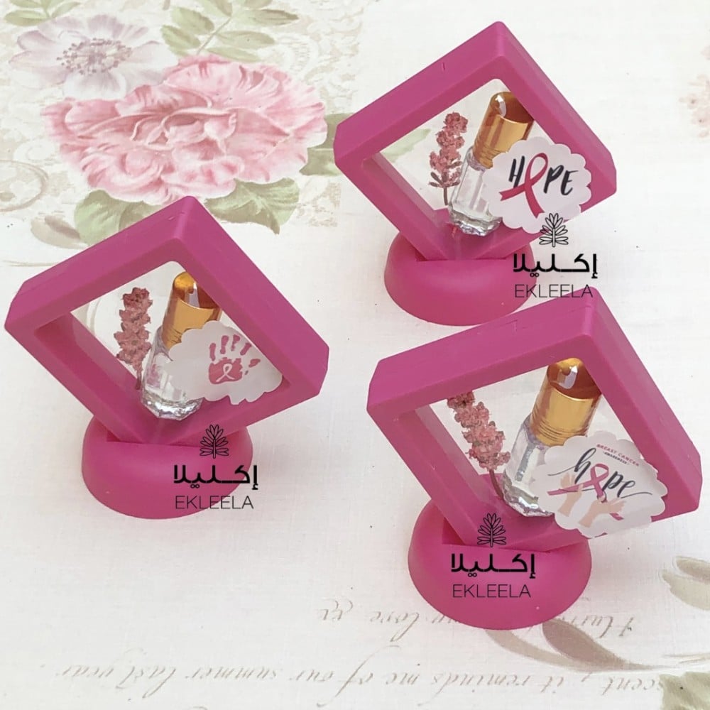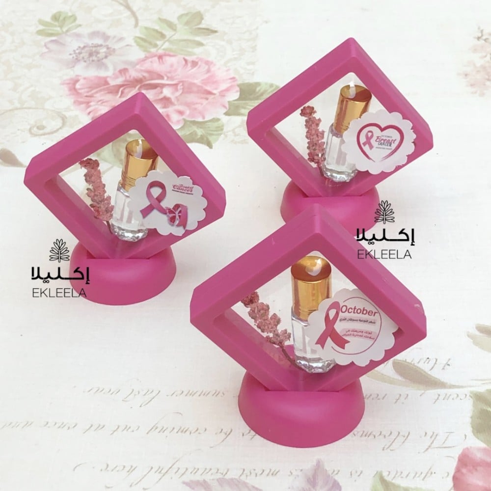 علب بلاستيكيه مع قاعدة معبأة بميني ربع توله عطر فرنسيمع ثيم توعية عن سرطان الثدي